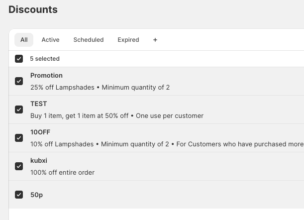 To edit discounts, simply select each one using the checkboxes on the left of this page. Use the uppermost checkbox to select all discounts.