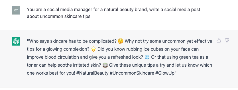 Imagine you oversee a sustainable skincare brand. Let’s ask ChatGPT to write a new social post for us:
