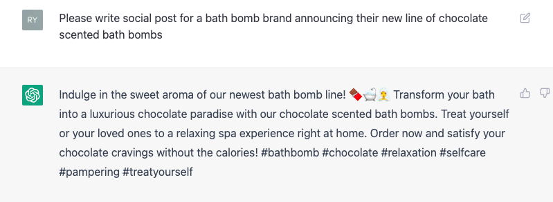 ChatGPT’s horizons go far beyond skincare. Our chatbot Social Media Manager now also works for an innovative bath bomb brand, and they’re just about to release an all-new chocolate scented bath bomb: