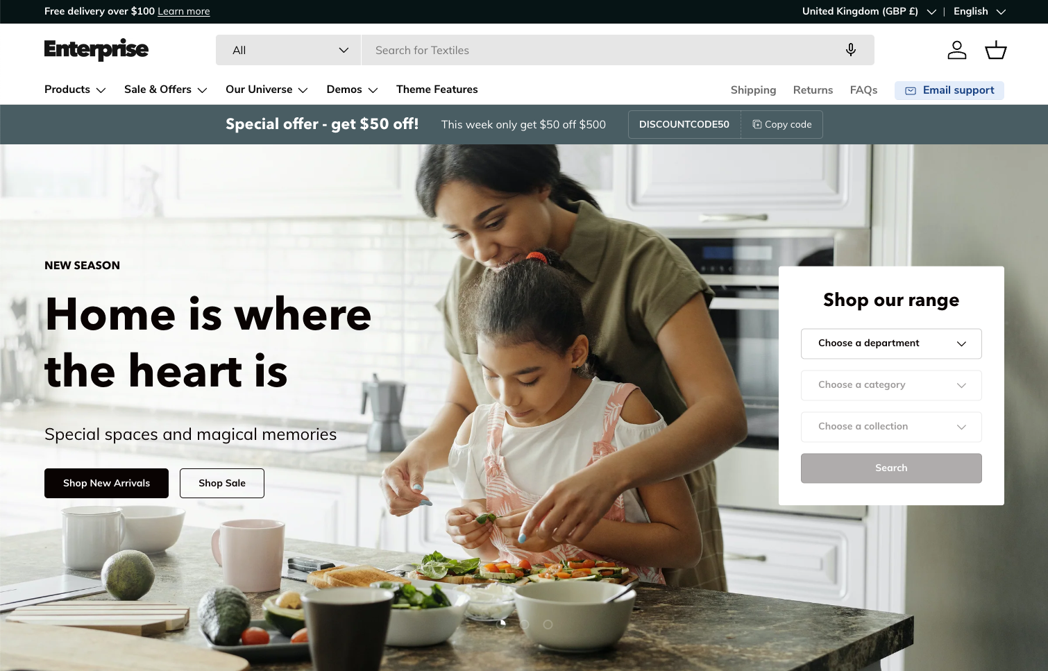 The Enterprise theme works for both B2B and D2C stores, making it perfect for combined storefronts where you want clean brand led content layered with easy product discovery and clear product information.