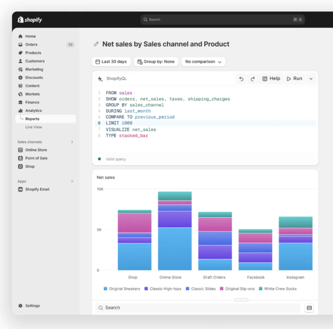 - Custom ShopifyQL queries: Access real-time data for bespoke reporting.