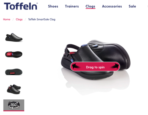 Provide different camera angles that go further than just a front and side view. Think about what your customers will be wanting to see, and go the extra mile. If you’re selling a pair of shoes, for example, your potential customer will not only need to see front, side and back angles. By also giving them a birds eye view that shows the inside of the shoe, you’ll provide them with the closest experience they can have to seeing it in real life, as they would almost certainly look there in any brick and mortar shoe store. Toffeln, who sell comfort-focused shoes to the healthcare industry, have taken this one step further by providing a 360 view of their best-selling clog, giving yet another layer of customer interaction.