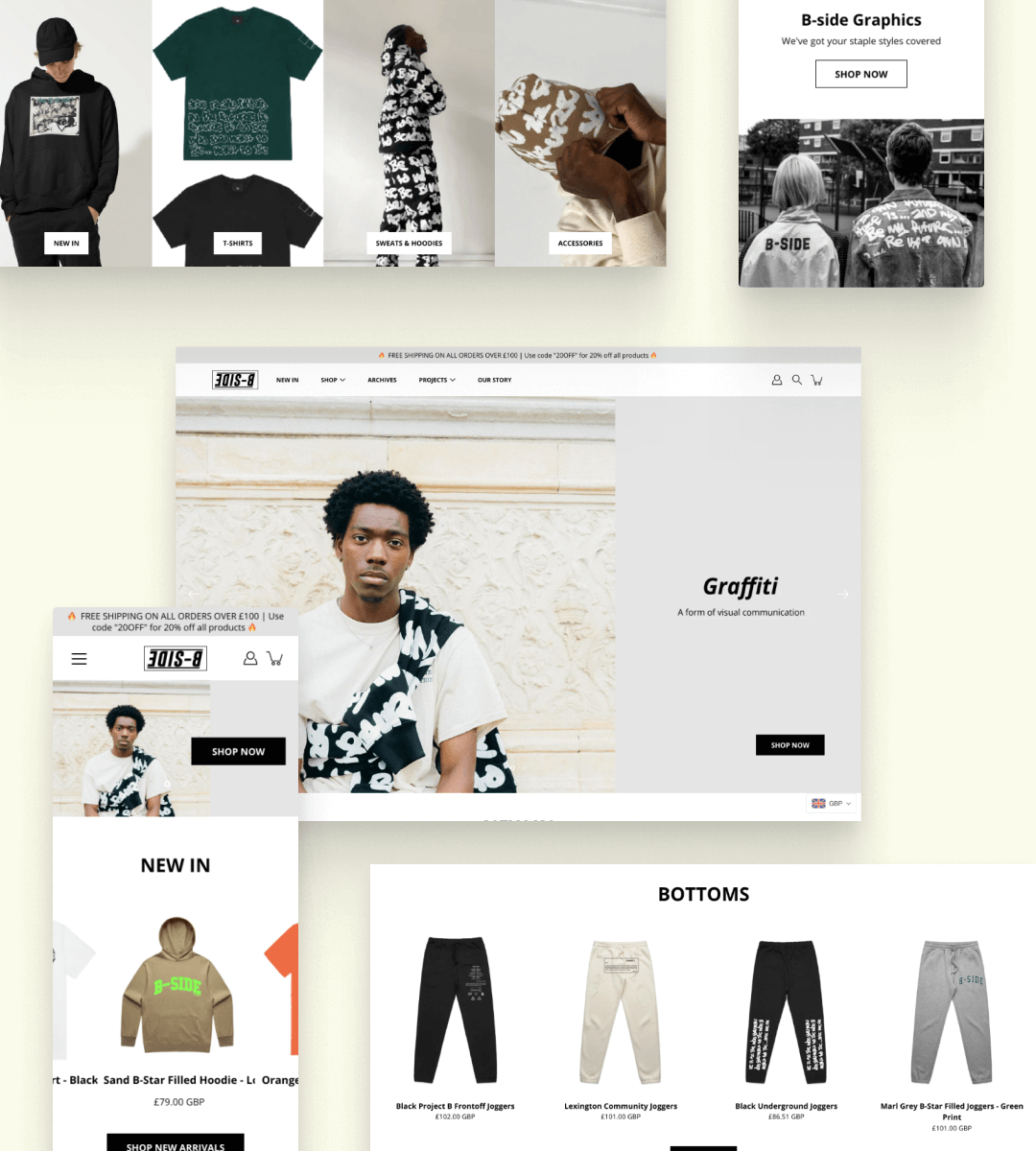 When B-Side first started to work with us, their old website was already on Shopify and they knew the platform well. It had been built in-house and despite a steady influx of traffic, it was proving hard to navigate for B-Side shoppers and putting off would-be customers. Walé and his team needed a flexible, modern Shopify theme that would reflect the diversity of the London capital and its changing streetwear trends.