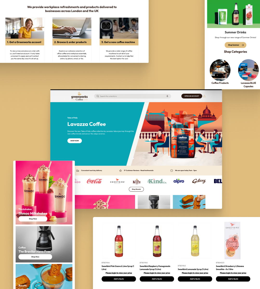 Greenworks Coffee is a UK-based B2B coffee supplier under the Greenworks Solutions group, serving businesses with premium coffee, equipment, and workplace refreshments. Alongside sister brand Zepbrook, the company has built a strong reputation for quality service and reliable delivery to offices, hospitality venues, and trade customers nationwide. Kubix rebuilt both Greenworks Coffee and Zepbrook from the ground up on Shopify, replacing legacy platforms that were holding back speed and scalability. The focus was on giving teams greater control, faster turnaround times, and a smoother purchasing experience for trade customers. We delivered a dual-site migration, transferring data and integrating Sage through Zynk for real-time product, pricing, and customer sync. By introducing SparkLayer, both stores gained full B2B functionality with customer-specific pricing, trade catalogues, and improved ordering. After launch, Kubix implemented a targeted marketing strategy across Google Ads, Meta, email, and SMS, supported by copywriting and creative design. These campaigns helped both brands grow visibility, strengthen retention, and reach a wider audience of B2B buyers.