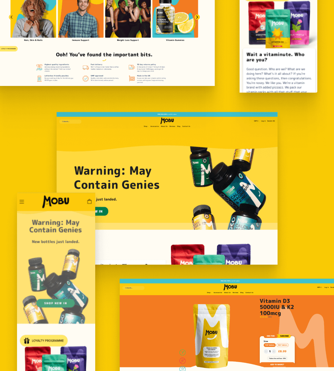 The first Mobu site was set up on Shopify with a basic theme where Moe could start to upload his own fully tested range of vitamins and nutrients. He sourced his first selection of vitamins in tablet and gummy form, with the aim to help people in their daily routines and offer natural, vegan solutions to their aches and pains. But, as with any first version of a website, before long Moe started to feel like his own brand was getting a bit creaky. He wanted a website that could reflect the fun, friendly nature of his products. Our team knew we could help, and that this was a project definitely worth taking on.