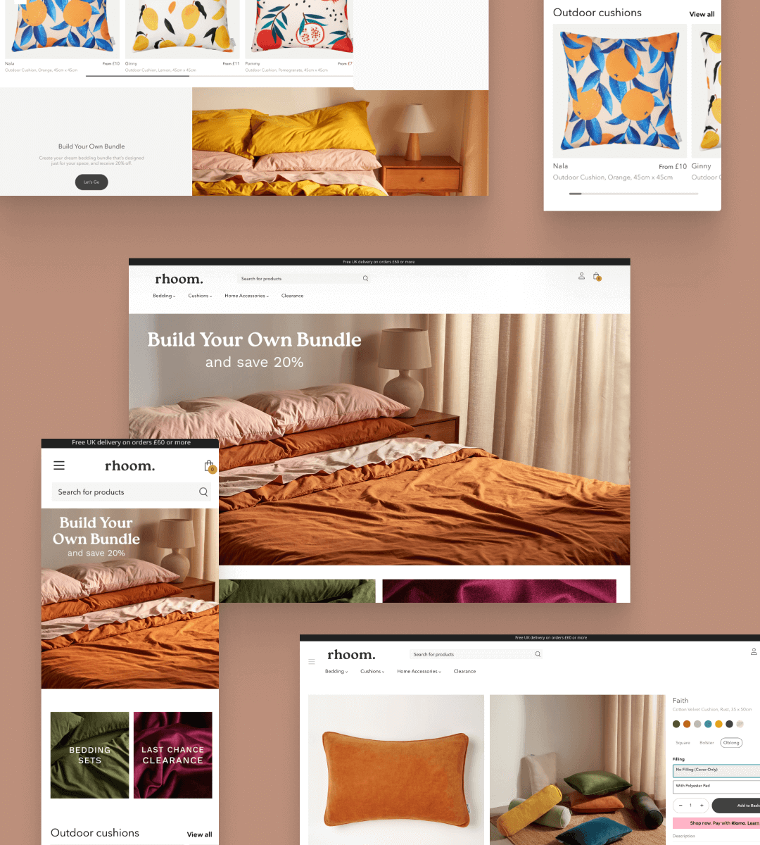Cushoo owners Robin and Lee had already made a name for themselves selling high-end cushions at affordable prices. Now they had a vision to move further into the homeware industry, adding rugs, throws, vases and more to their product offering. This new smorgasbord of home comforts called for a rebrand: a new name, a new look, and a whole new website. Enter: Rhoom. This new identity was destined to solidify them as a big name in the world of home interiors.