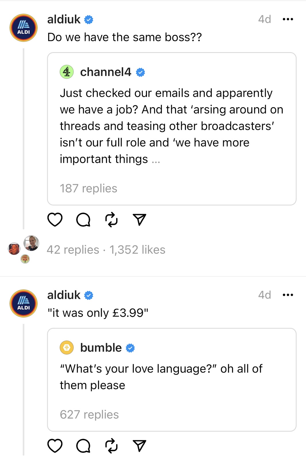 Some are taking the conversation to other brands. Here Twitter favourite Aldi gets chatting with Channel 4 and the dating app Bumble.